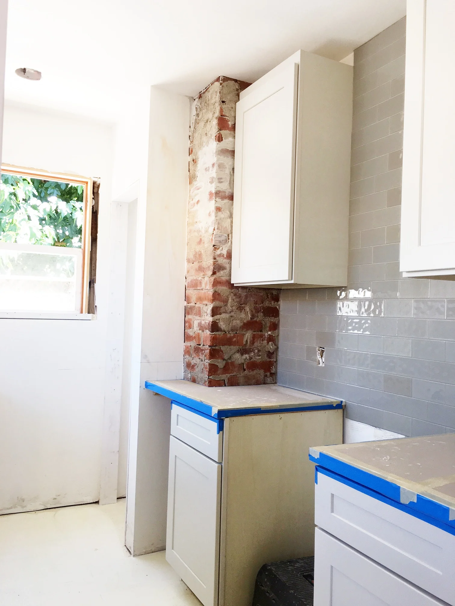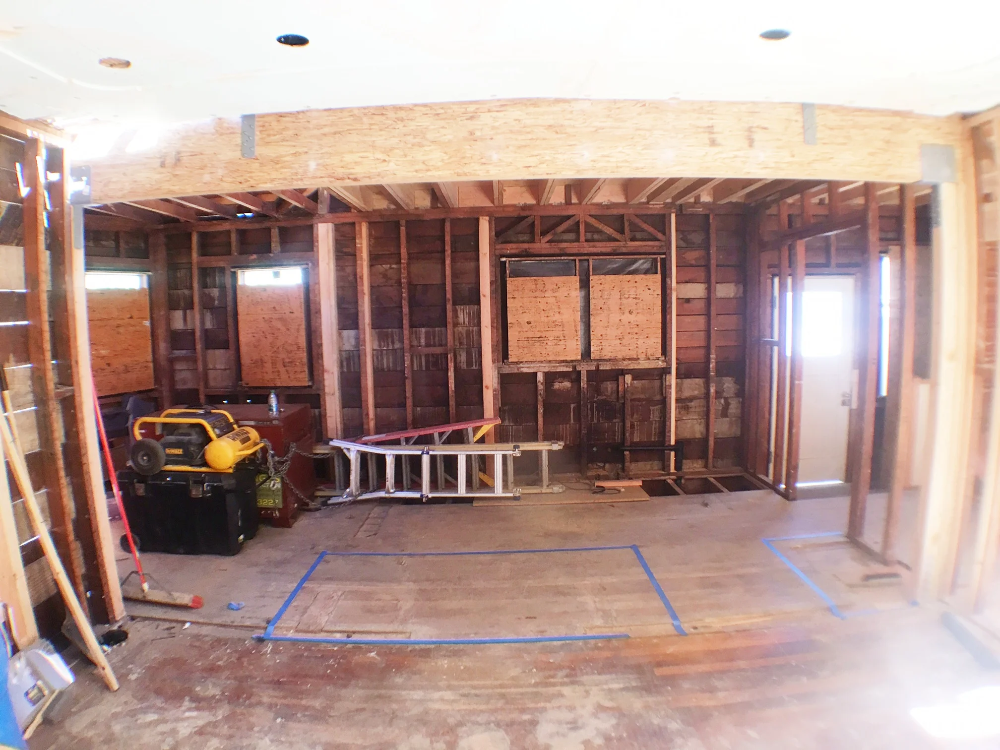 Now that the walls are opened up and headers are in, we are taping off the area (see blue tape) to look at where the cabinets, fridge and 7-ft island!!! will go.
