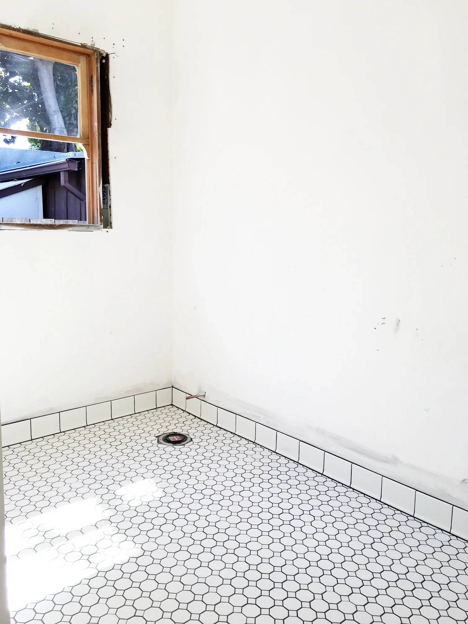 The floor tile is in. We chose a white hexagonal pattern with very dark gray grout. Lookin' good! Next: Installing the vanity and my fun job of restoring the claw foot tub. Ugh.