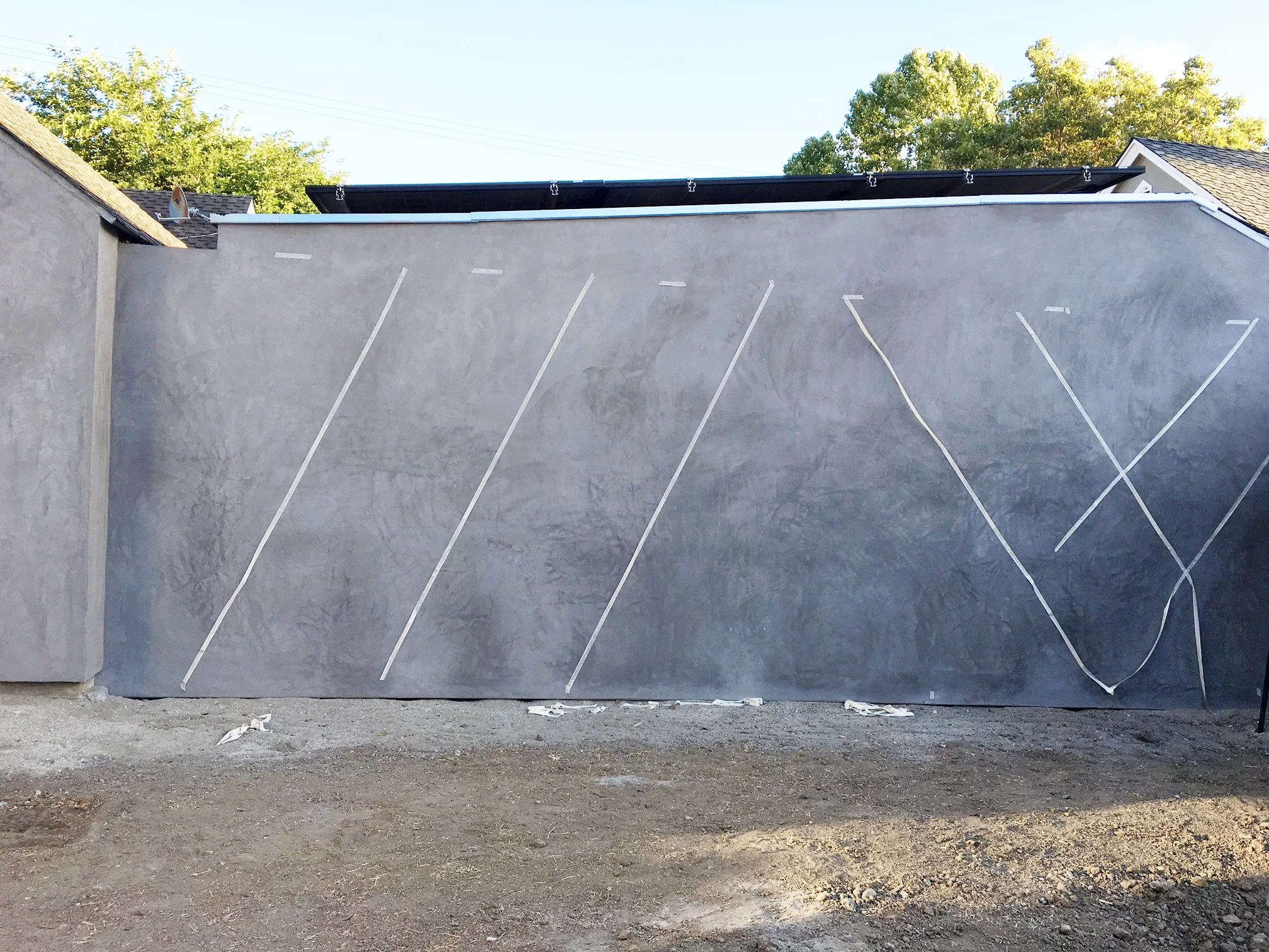 Here's what its looking like now. We covered both walls with stucco so it feels cleaner and more consistent. Next, we are going to espalier vines up the wall in a criss-cross fashion. Here's my lame tape job looking at different angles.