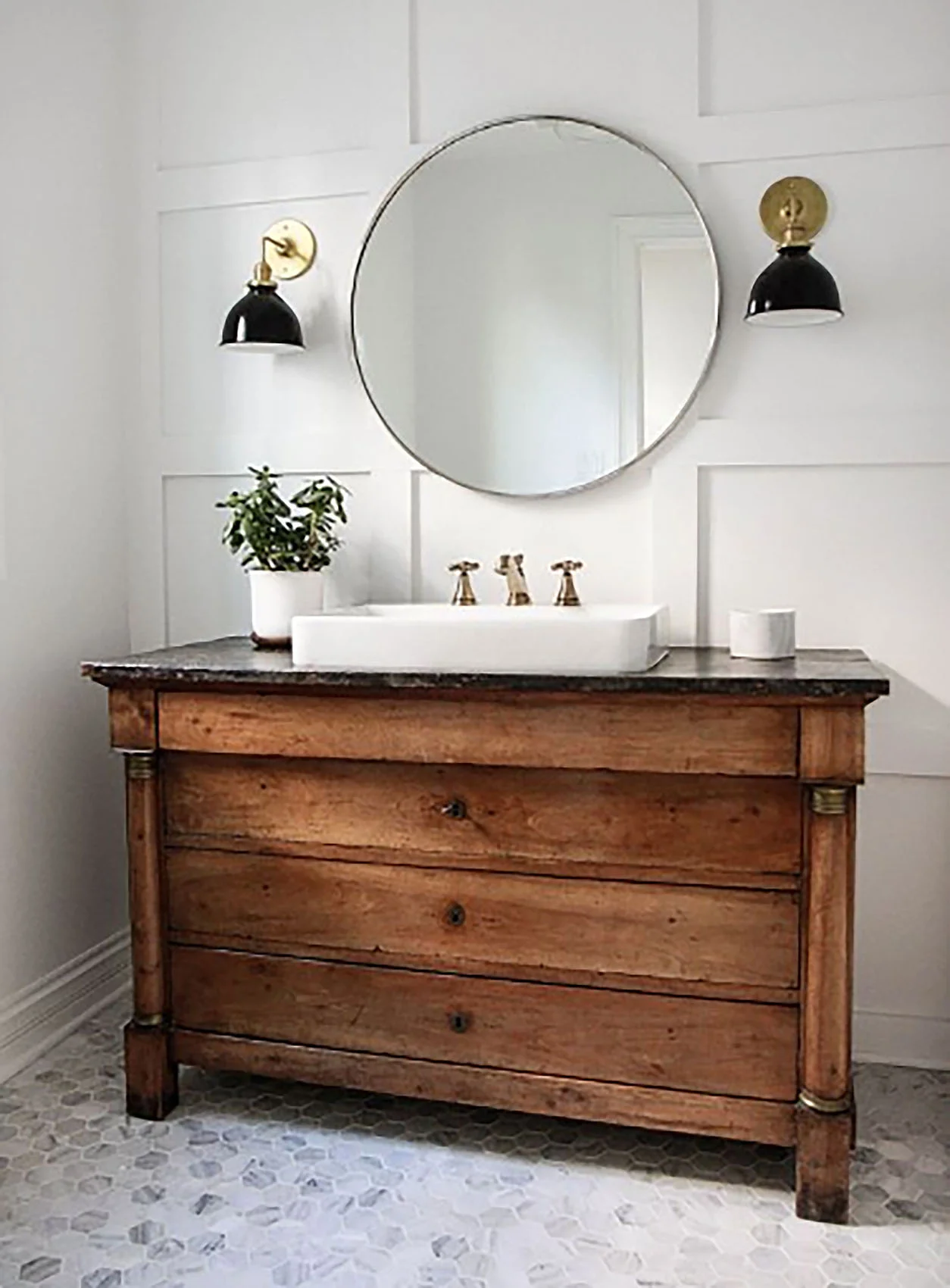 Here's my cottage bathroom inspiration. We found an old dresser that we converted to a vanity. We've put black granite countertops on it.