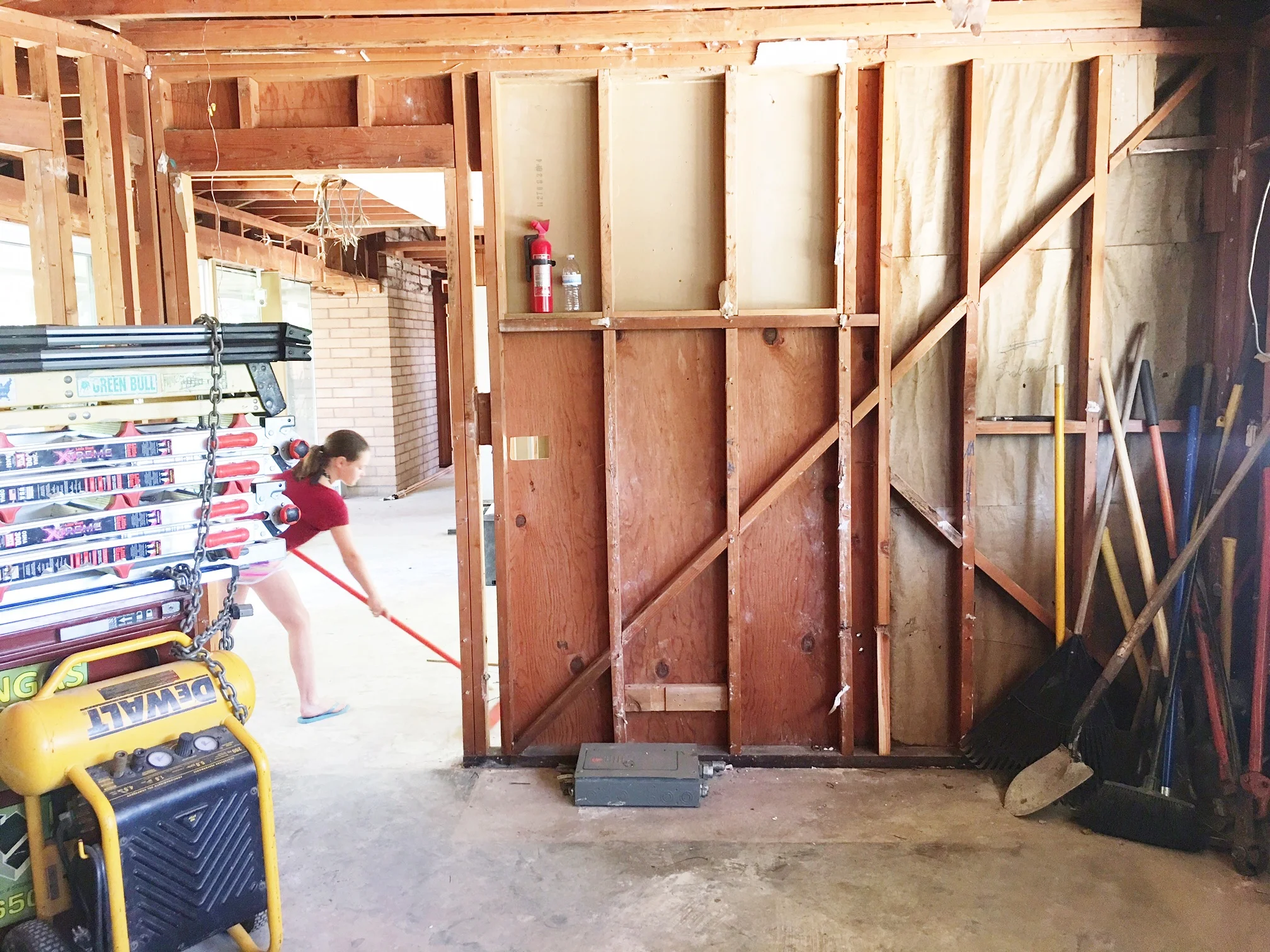 Lucy cleaning the job site in the dining room before the walls came down.