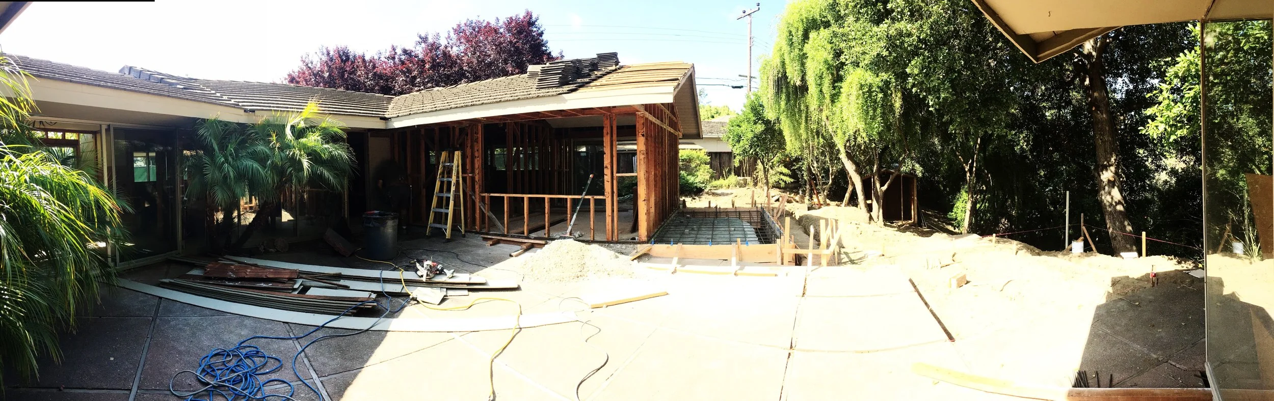 Here is a pano shot of the courtyard, master bedroom and soon-to-be deck to the right.