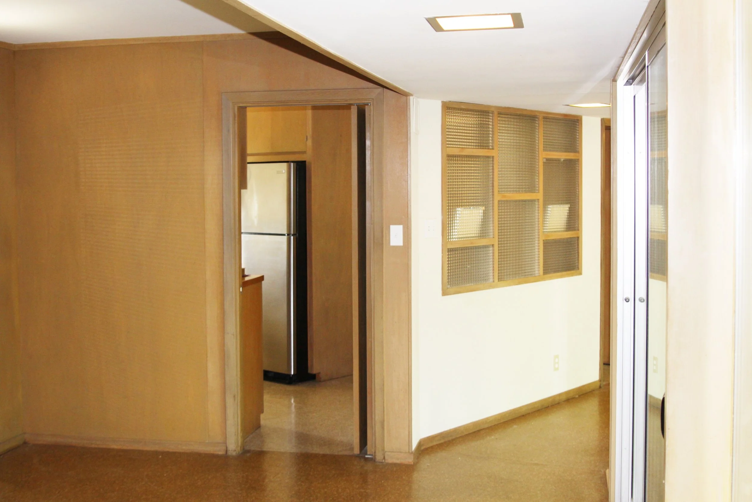 Just to remind you, here's what the kitchen looked like from the dining room. We are removing the wall on the right with the groovy grid-like object in it. Don't worry, we have a very cool home for it. Just wait and see.