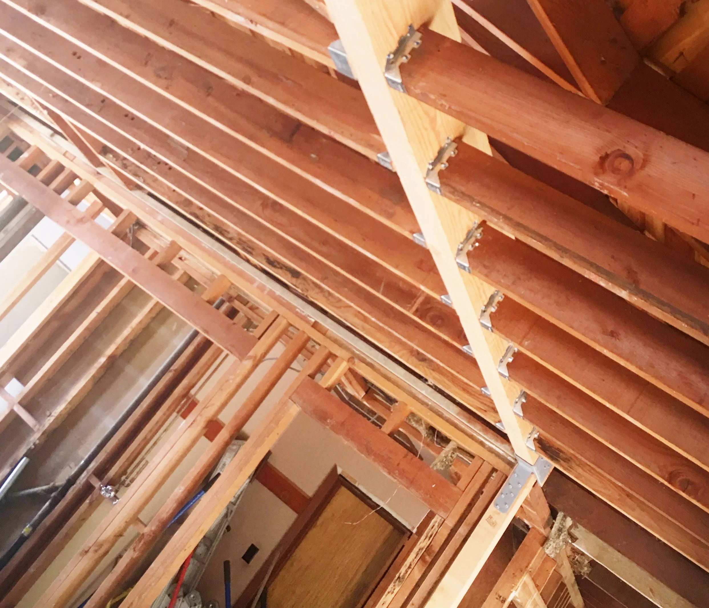 This new structural header, along with the connected vertical post, holds the ceiling up. This allowed us to remove the wall.