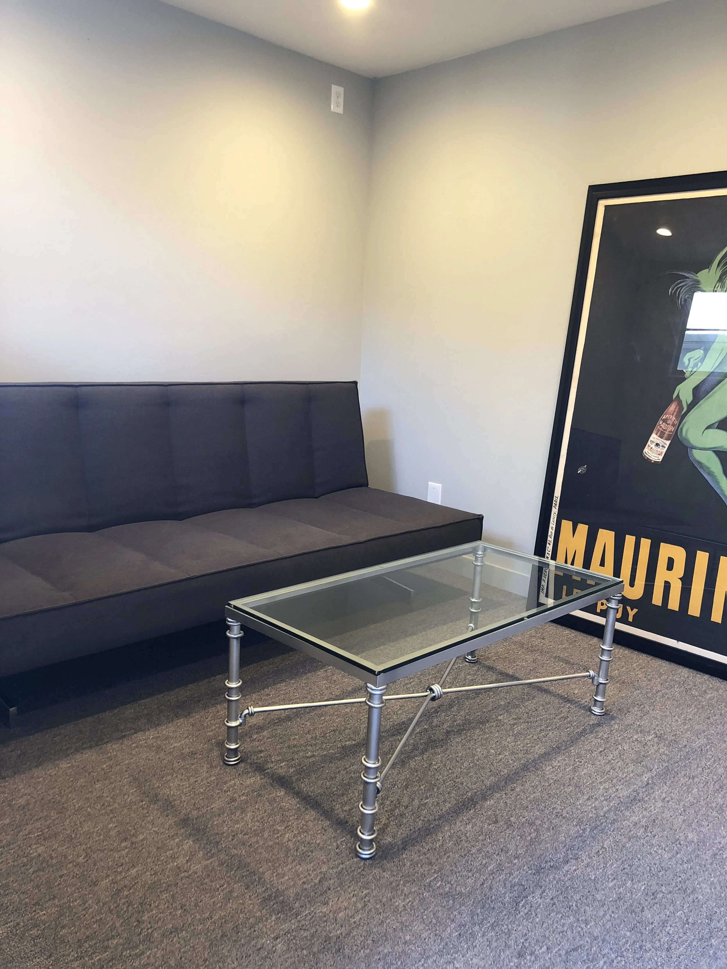 We knew this was going to double as a teen sleep over and guest room so we needed a couch that could pull out into a bed. My super good taste friend, @KellyNiland, has this futon from CB3 in orange. It’s super pricey but i found it super-cheap on Craigslist. Check! And the dark gray will help hide the popcorn hand prints right? Maybe. Moving on: Lance’s mom’s old coffee table spray painted by Lucy Richards. Vintage french poster which has been hauled around to every place I’ve ever lived.