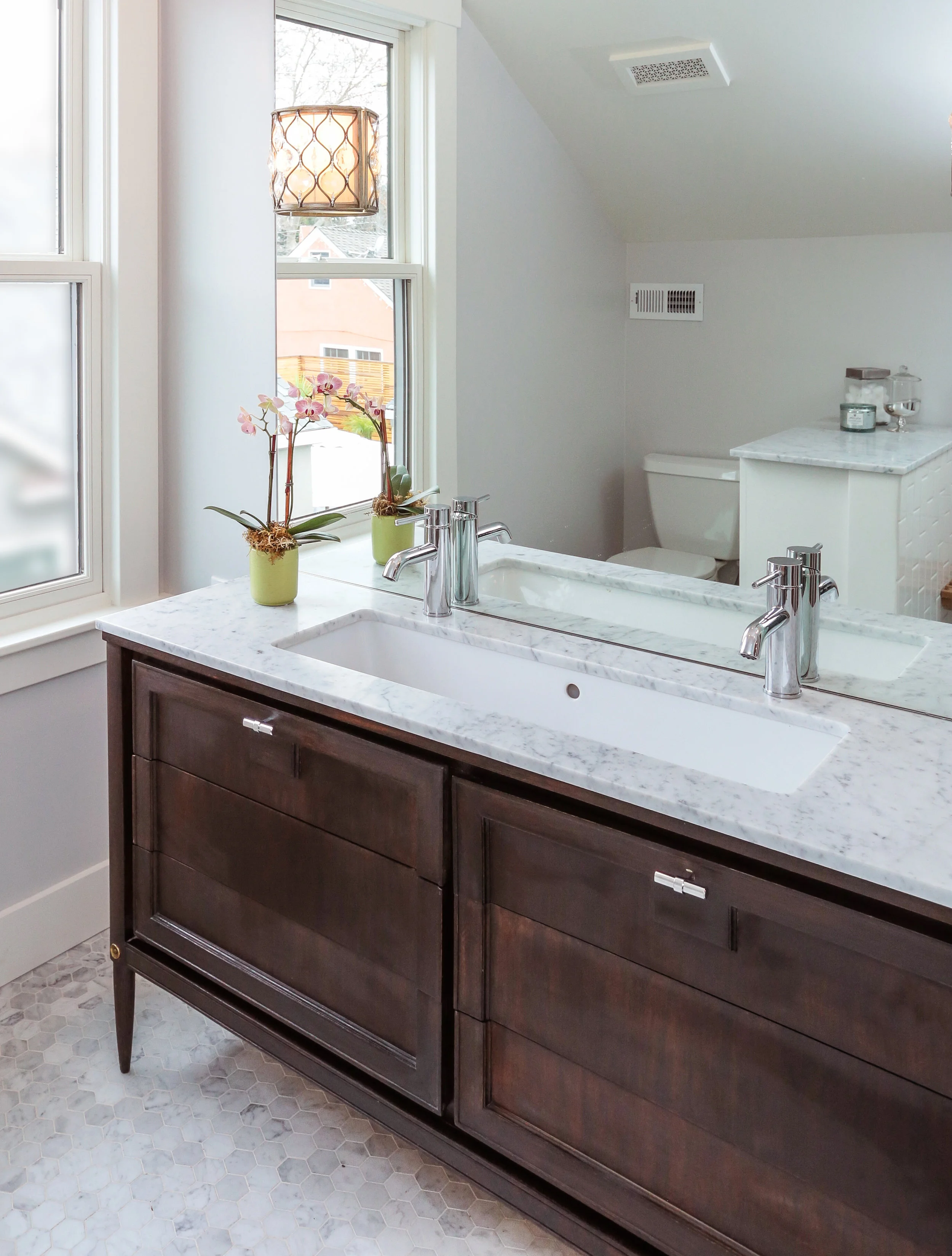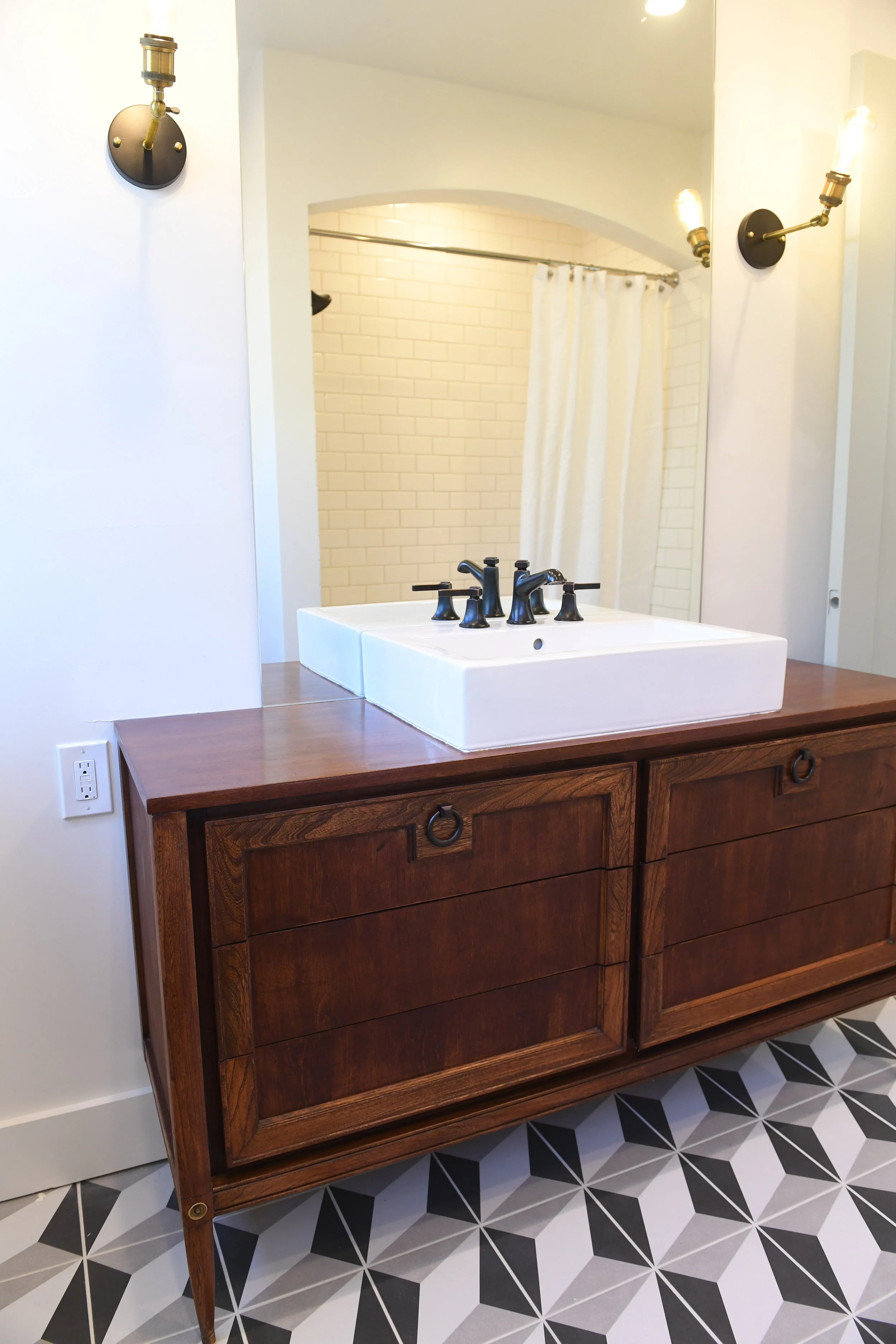 If you look closely, you'll notice that this is the same vintage dresser style as the one we used for the guest bathroom. This time, we went with an Espresso color with more modern drawer pulls. The vanity wasn't long enough for two sinks. And we've heard that marriages survive better with separate bathrooms and, at the very least, two sinks, we decided to go for a trough sink with two faucets instead. It's sort of like two sinks, right?