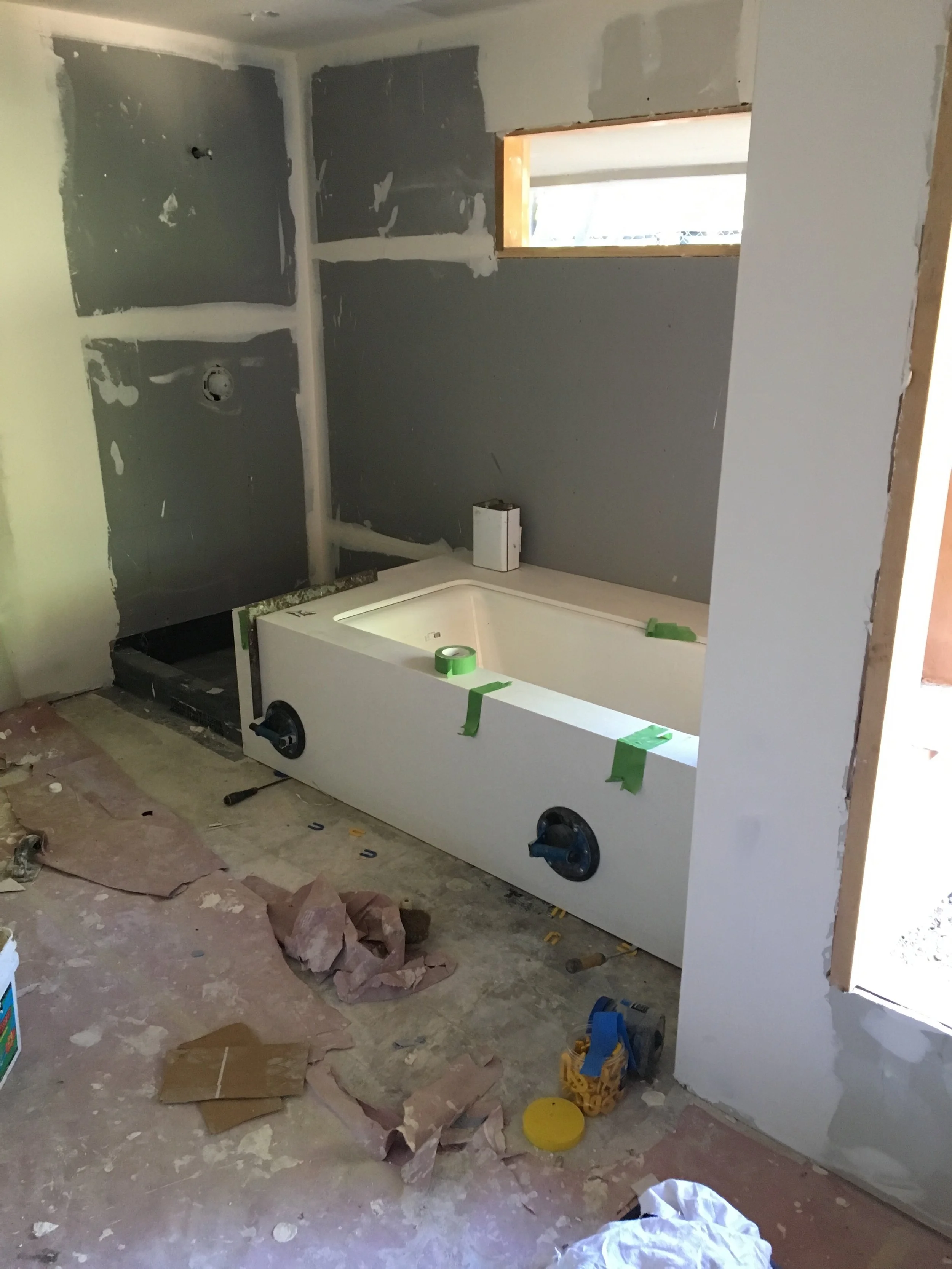 You can see that the bathtub with the fab sparkly Caesarstone has been installed. We extended the top of the tub to allow for some sitting space. We also created a "waterfall" front to modernize the look of it. The floor went in today. Isn't it fabulous?