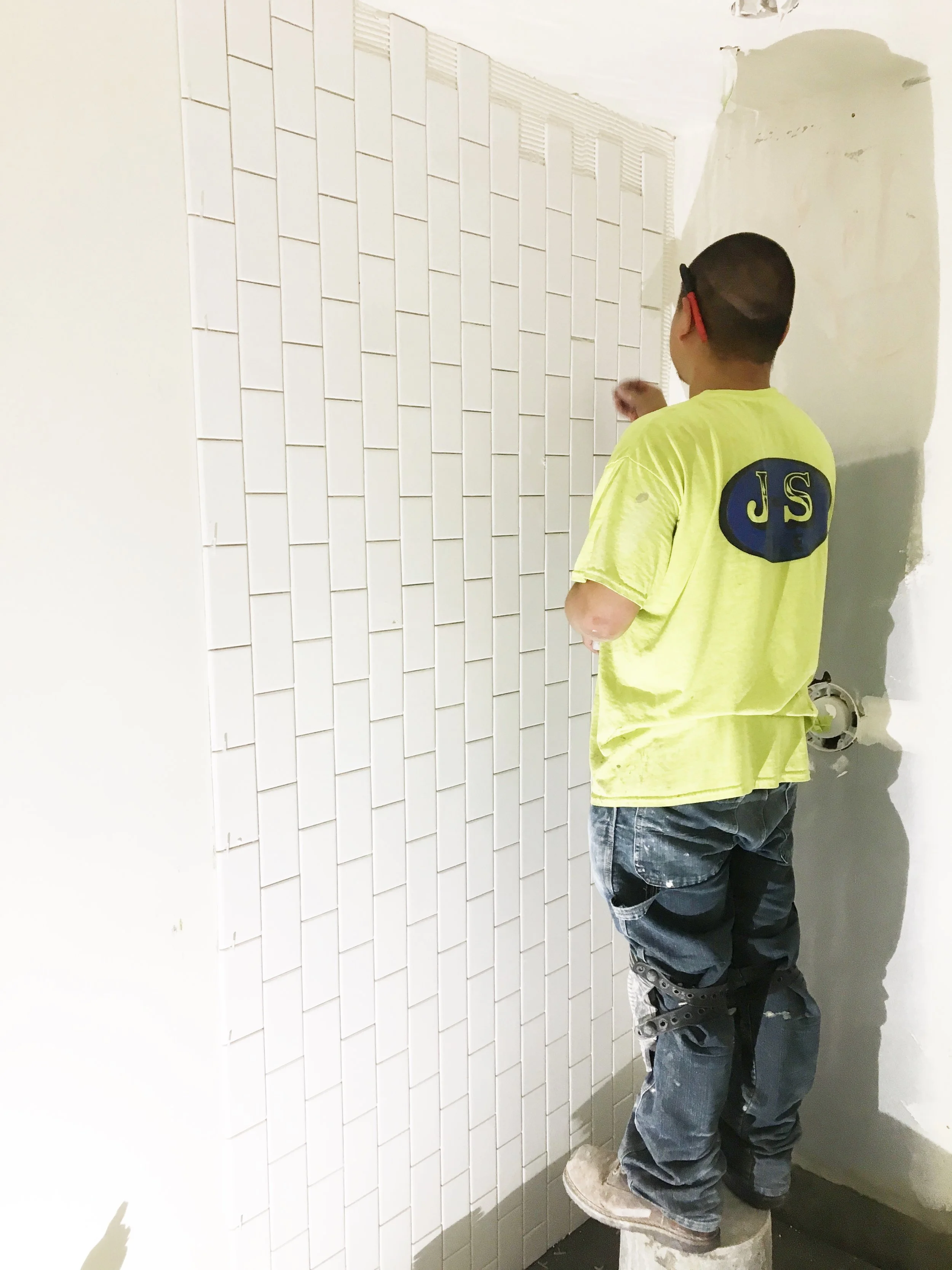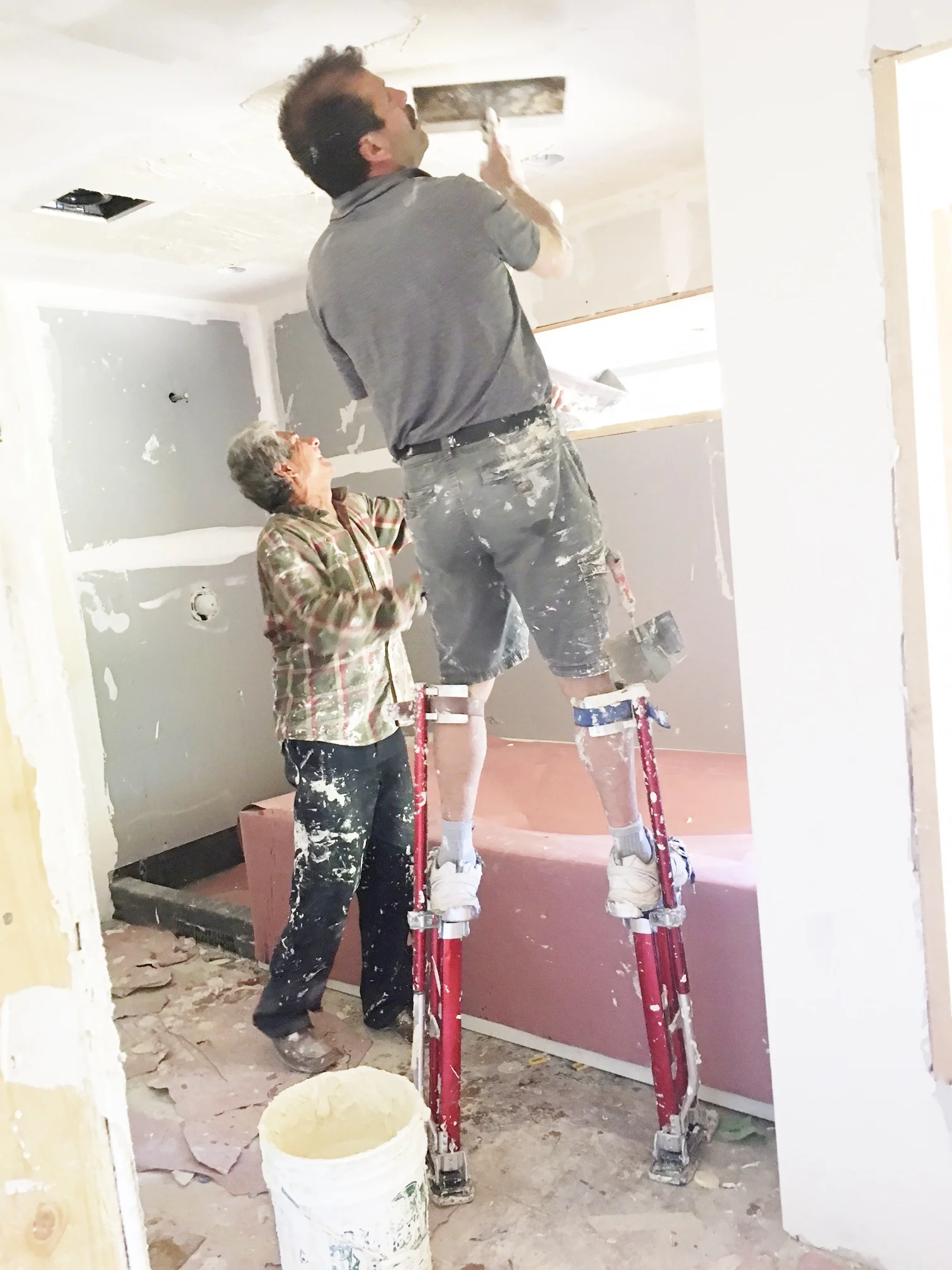 This is our amazing dry-wall /plaster guy, Santiago, of Pena & Pena Drywall (his wife does all the estimations and even helped out taping the closets at Weaver). Check him out of stilts!