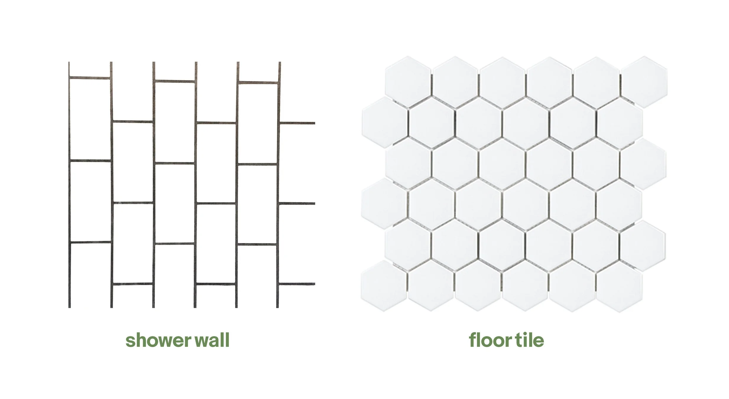 This bathroom is small so we've done it all white and very simple. We've chosen a traditional white subway tile, but laying it vertically for a bit more of a modern look. And the floor is a simple hexagon but with a matte finish, which is a little fancy!