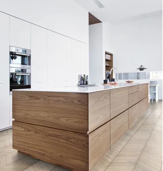 There was a a lot of debate about the laminate and if it should go on all the cabinets. Or, just the island and paint the cabinets. In the end, since there is so much wood in the house already, we decided to paint the cabinet dark gray, since that's the first thing you see from the entry hall. And then the rest of the cabinets will be the Loft Oak Laminate.