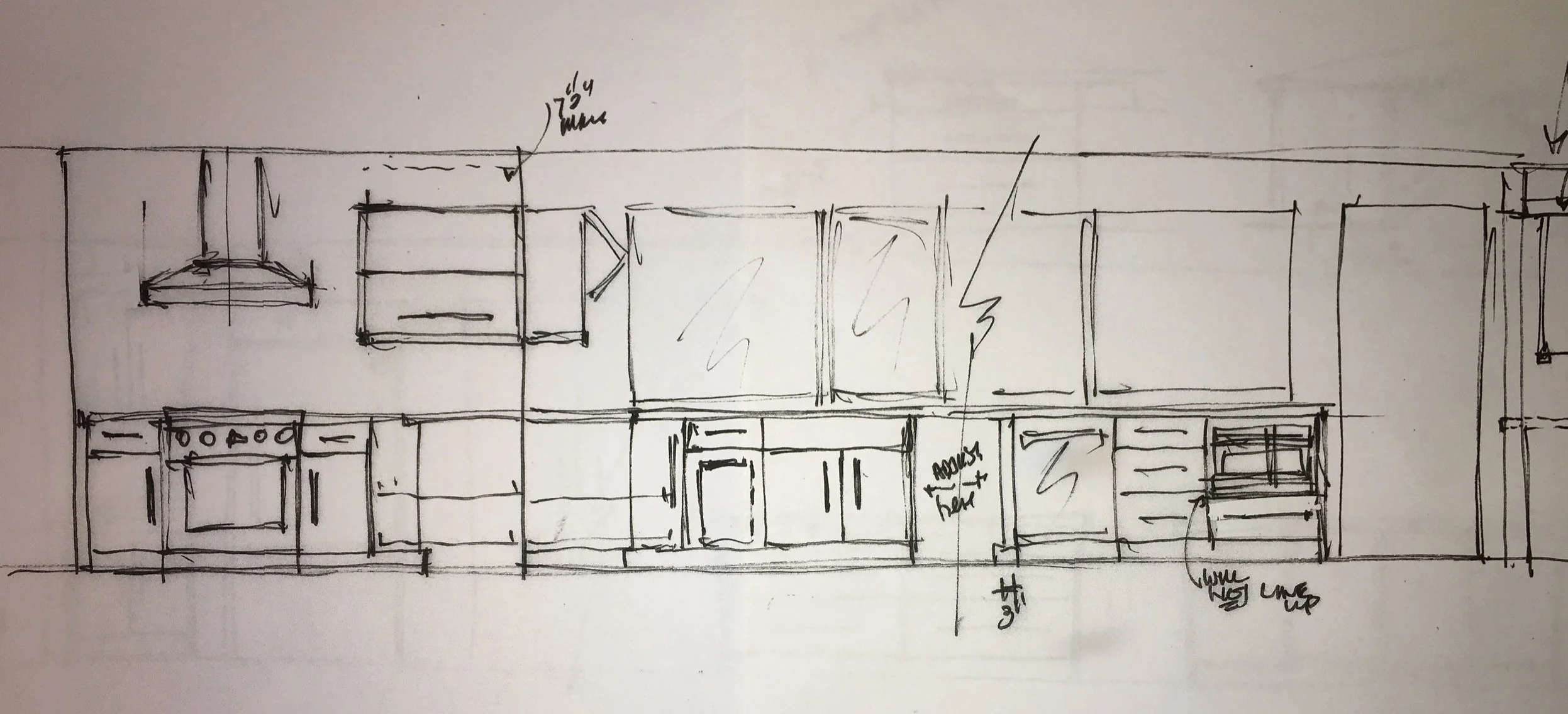 This is another elevation drawing. It is not one straight line. The wall with the stove turns a corner but its easier (and cooler) to view this way. As you can see, we have one upper cabinet to the left of the stove.